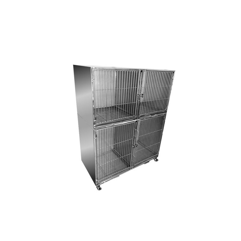 Este canil gaiola em inox possui configuração modular com quatro compartimentos, distribuídos em níveis que favorecem a organização do setor veterinário. O módulo inferior grande disponibiliza maior área interna, enquanto o módulo intermediário duplo permite alojamento independente adicional.